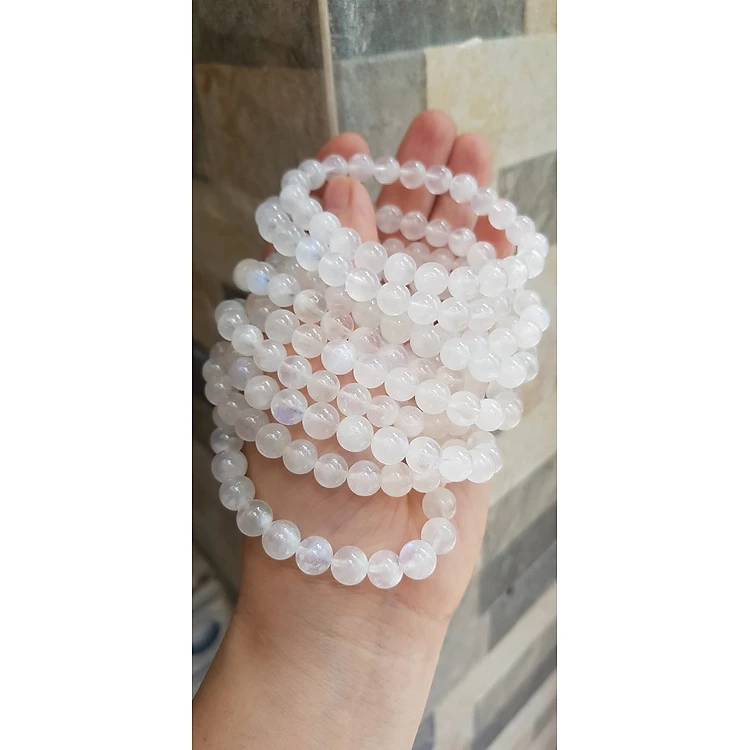 Vòng tay phong thuỷ may mắn moon trắng tự nhiên 8mm hay đá ánh trăng trắng trong bóng đẹp size vòng hạt 8mm màu trắng trong sáng tươi đẹp chuẩn hợp nữ mệnh kim mệnh thuỷ đeo ạ