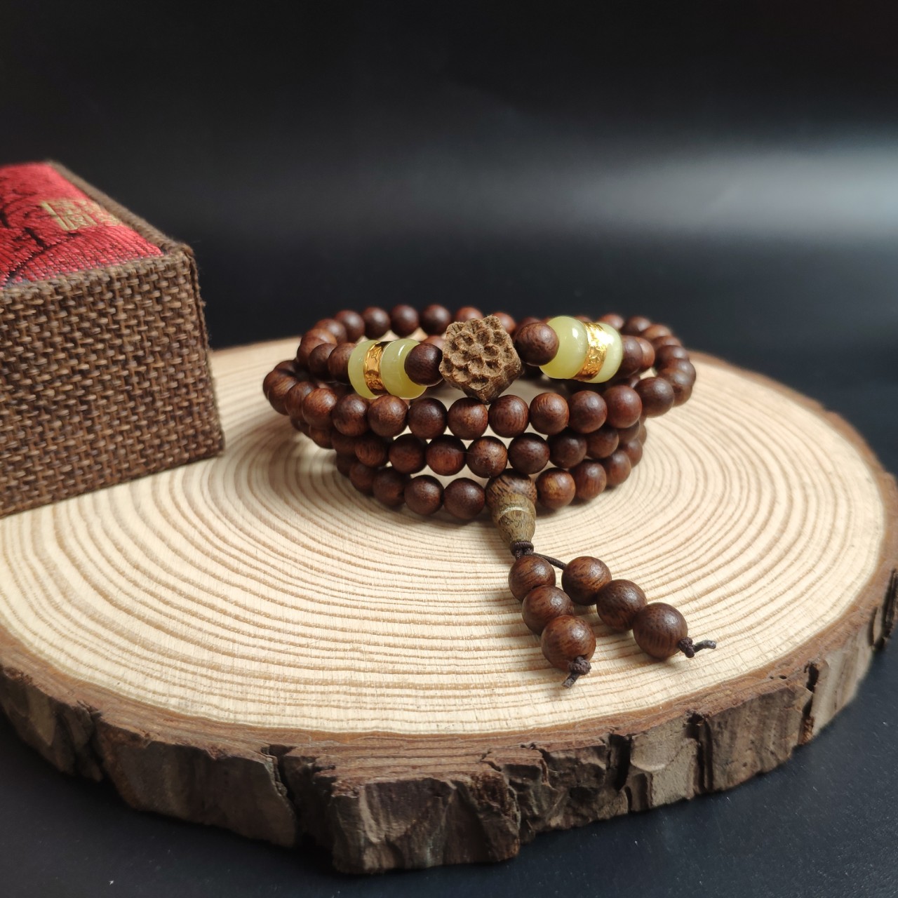Vòng Tay Trầm Hương 108 Hạt Mix Sen Tốc & Lu Thống Màu Vàng