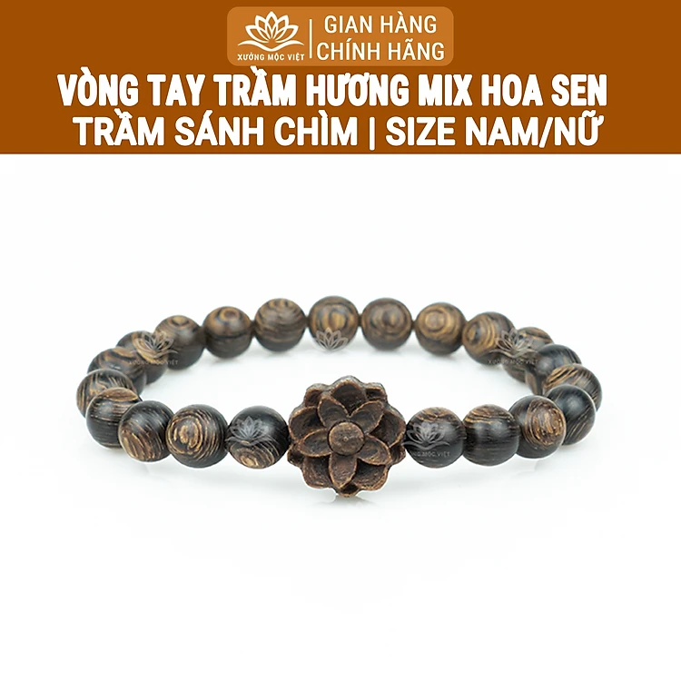 Vòng Tay Trầm Hương Sánh Chìm Cao Cấp Mix Charm Hoa Sen - Vòng Tròn Đơn Size 8/10mm Mang Lại May Mắn, Bình An