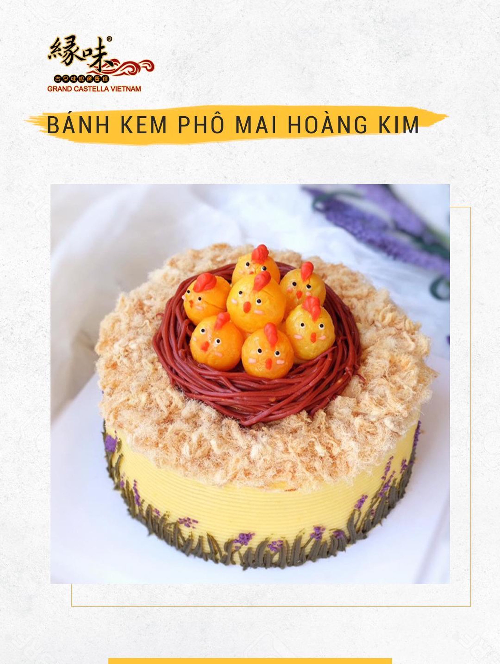 - Riêng Bánh Kem Phô Mai Hoàng Kim có Cốt Bánh Bông Lan Hoàng Kim 6 lớp mềm mịn, thơm lừng, kèm các lớp kem Phô Mai, Sốt Hoàng Kim, Chà bông, Trứng Muối đan xen.