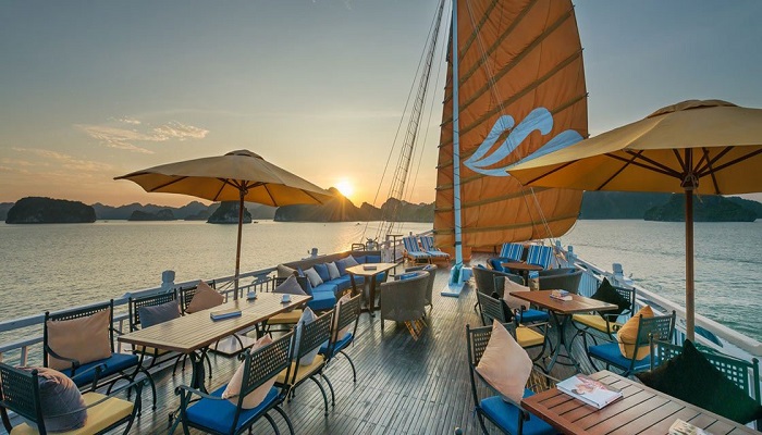 Các cabin được chia ra 3 loại: Superior, Deluxe và Suites, có cửa sổ, ban công rộng nhìn ra biển. Tầng cao nhất của du thuyền là một bar mở, nơi du khách có thể thưởng thức hàng trăm loại rượu vang, được tự do tắm nắng, đọc sách, nghe nhạc giữa thiên đường vịnh Hạ Long. Phòng tắm riêng được sử dụng vật liệu cao cấp đá marble và gỗ quý,ban công riêng, nhà hàng phục vụ các món ăn Âu Á, khu Spa, Massage, Sauna & Jacuzzi.