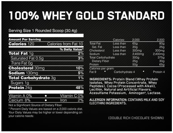 – Gold Standard 100% Whey Protein có thành phần chính chứa 2 loại protein cao cấp và dễ hấp thu: Whey Protein Isolates và Hydrolyze Whey (Microfiltered Whey Protein Isolates, Ion Exchange Whey Protein Isolates, Ultrafiltered Whey Protein Concentrate, và Hydrowhey Hydrolyze Whey Peptides).
