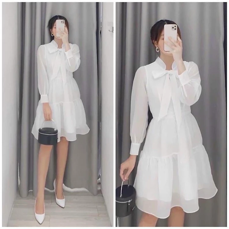 X2 Đầm trắng tiểu thư tầng nơ cổ tay phồng dài váy ngắn xòe công chúa dự tiệc dịu dàng thanh lịch