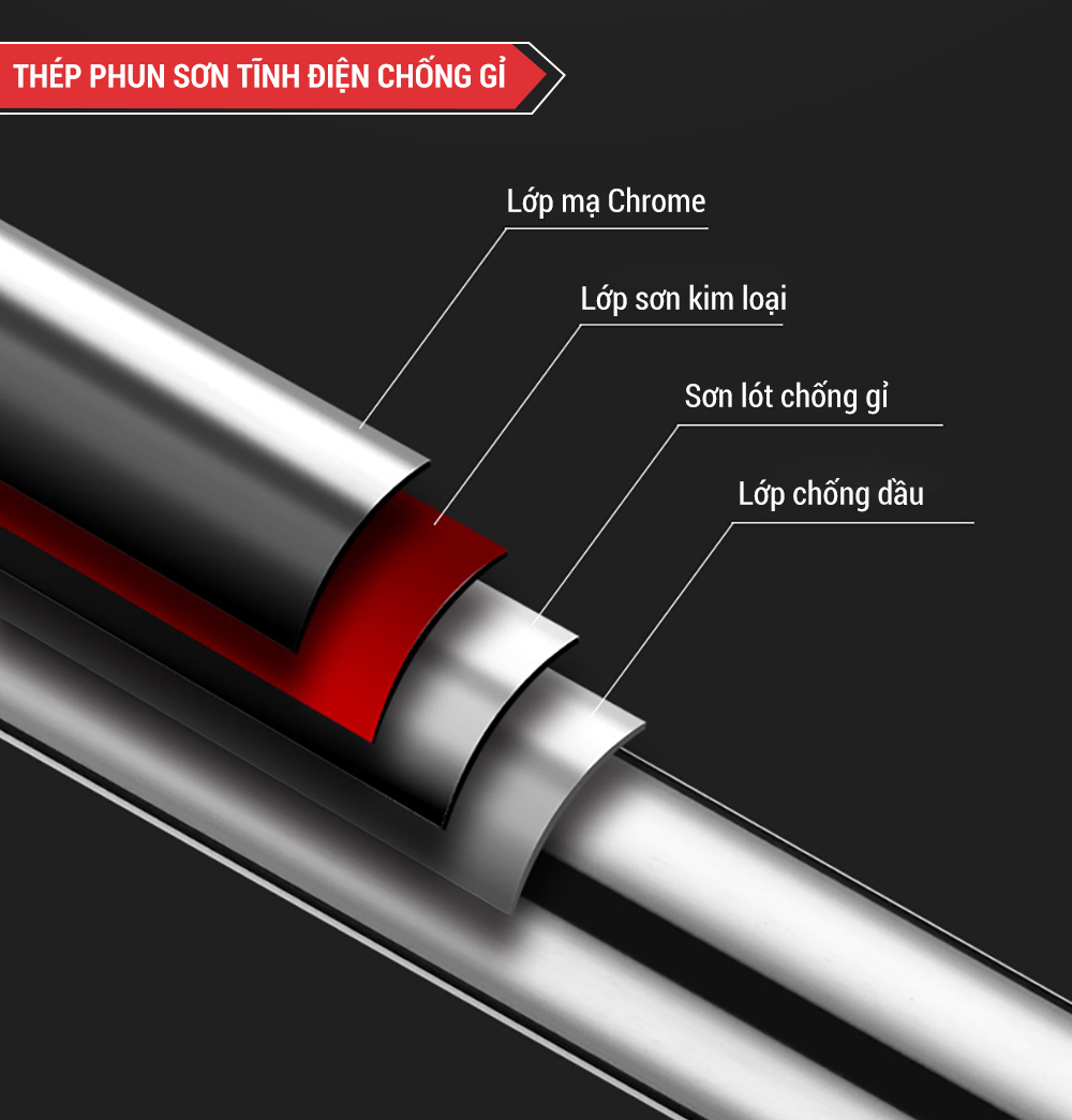 Nếu bạn lo ngại về việc một chiếc xà đơn gắn tường nhỏ bé như thế, sao có thể chống chịu được trọng lượng cơ thể 60-80 cân, thậm chí còn đu đưa liên tục, thì bạn hoàn toàn yên tâm khi dùng sản phẩm này. Kết cấu 4 lớp bao gồm: lớp mạ ngoài, kim loại phun sơn, lớp chống gỉ sét, lớp chống dầu. Nó được làm từ thép chịu lực chắc chắn, mạ inox chống han gỉ, nên đảm bảo an toàn 100%.