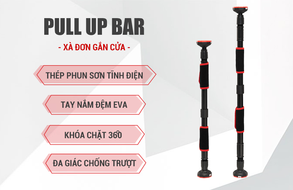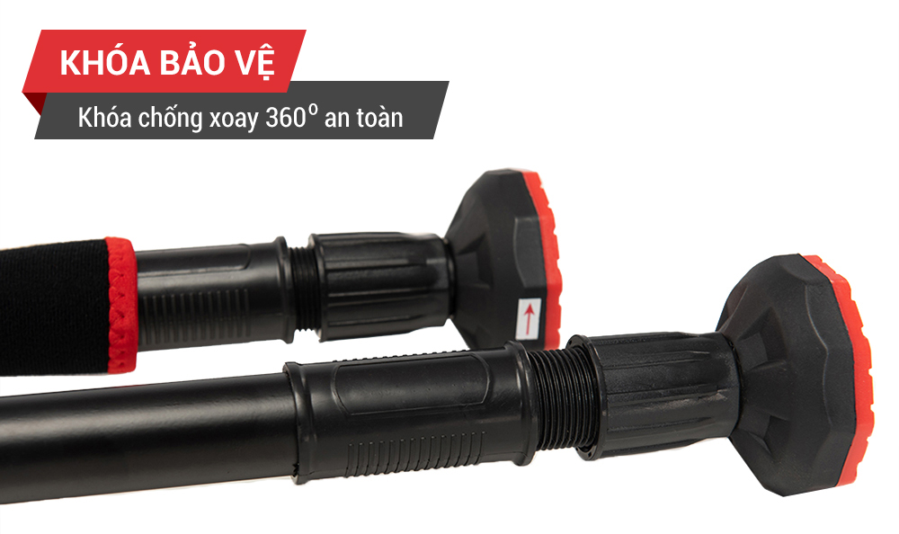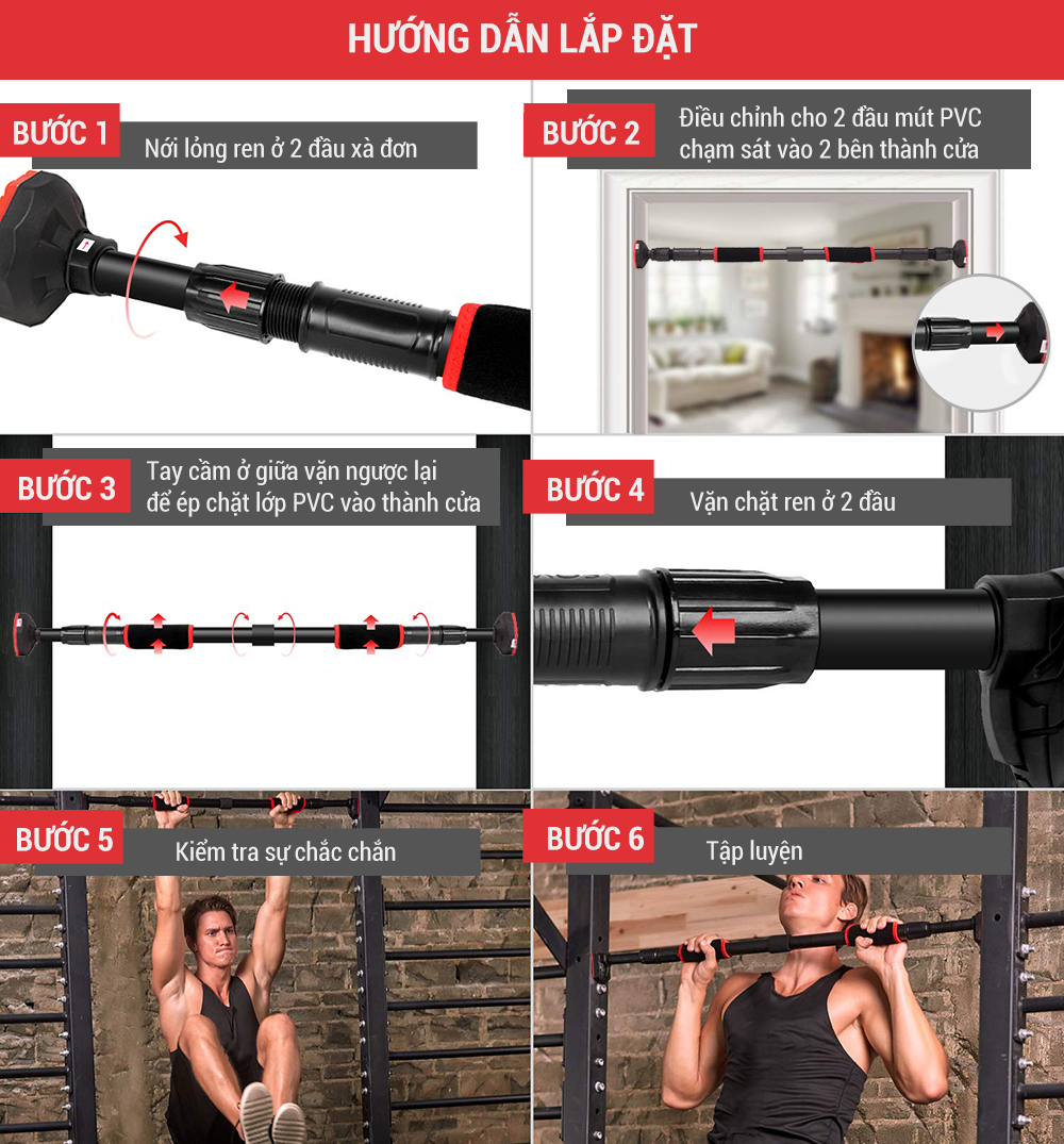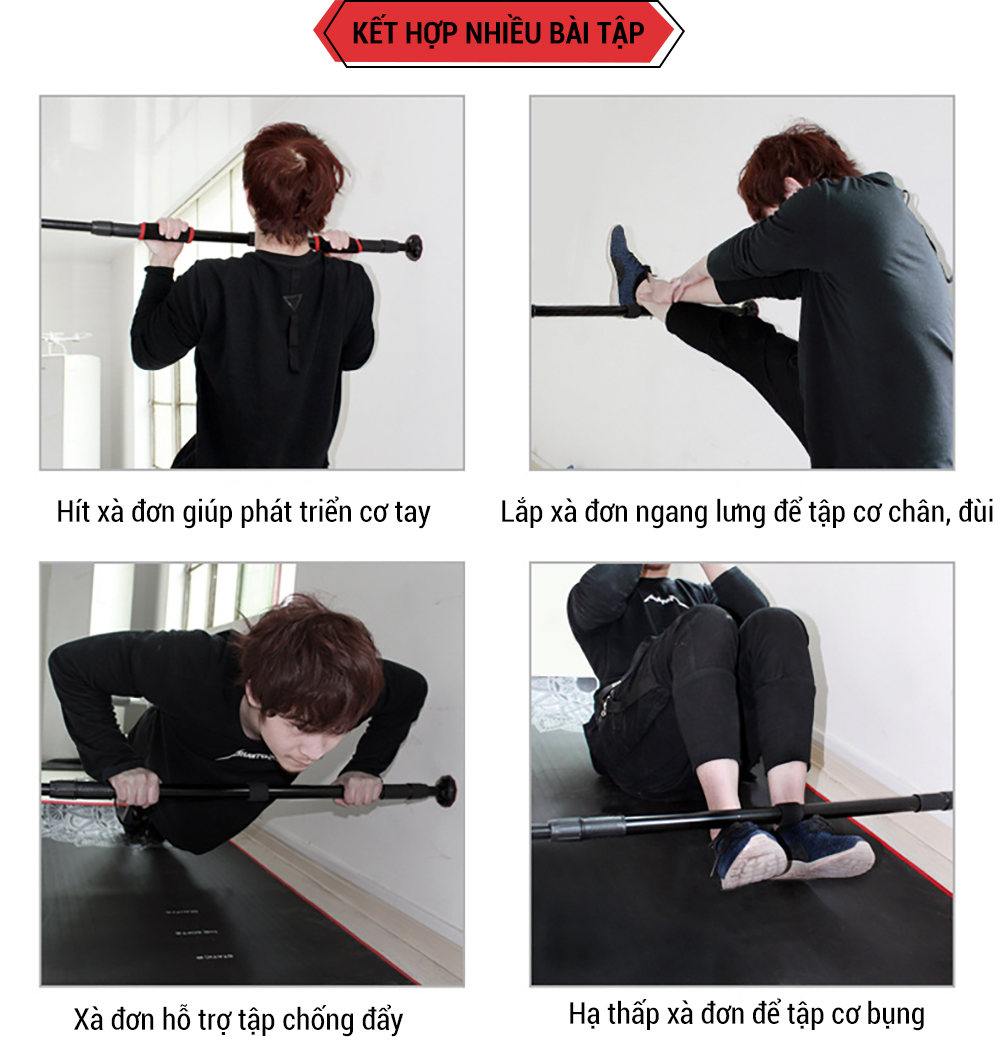 Xà đơn gắn cửa được làm theo công nghệ cải tiến mới rút ngắn thời gian lắp đặt, từ 1 phút xuống chỉ còn 10 giây nhờ hệ thống Pitton nén và cao su ở 2 đầu xà. Bạn chỉ cần ước lượng vị trí gắn lên, xoay ốc vặn khóa chốt là xong. Loại ốc này xoay chiều 360 độ và khóa rất chặt. Xà đơn thông minh khi có thể thay đổi kích thước tùy vào vị trí mà bạn lắp đặt, không cần lo ngại về việc khung cửa quá rộng hay quá hẹp.