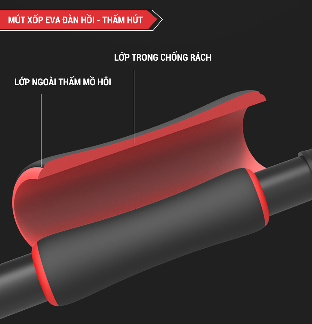 Phần tiếp xúc với tay được làm từ bọt xốp EVA 2 lớp: lớp ngoài thấm mồ hồi, lớp trong chống rách. Đặc biệt là mút xốp dày nên rất êm ái, giúp bạn không bị chai tay hay đau tay khi tập luyện.