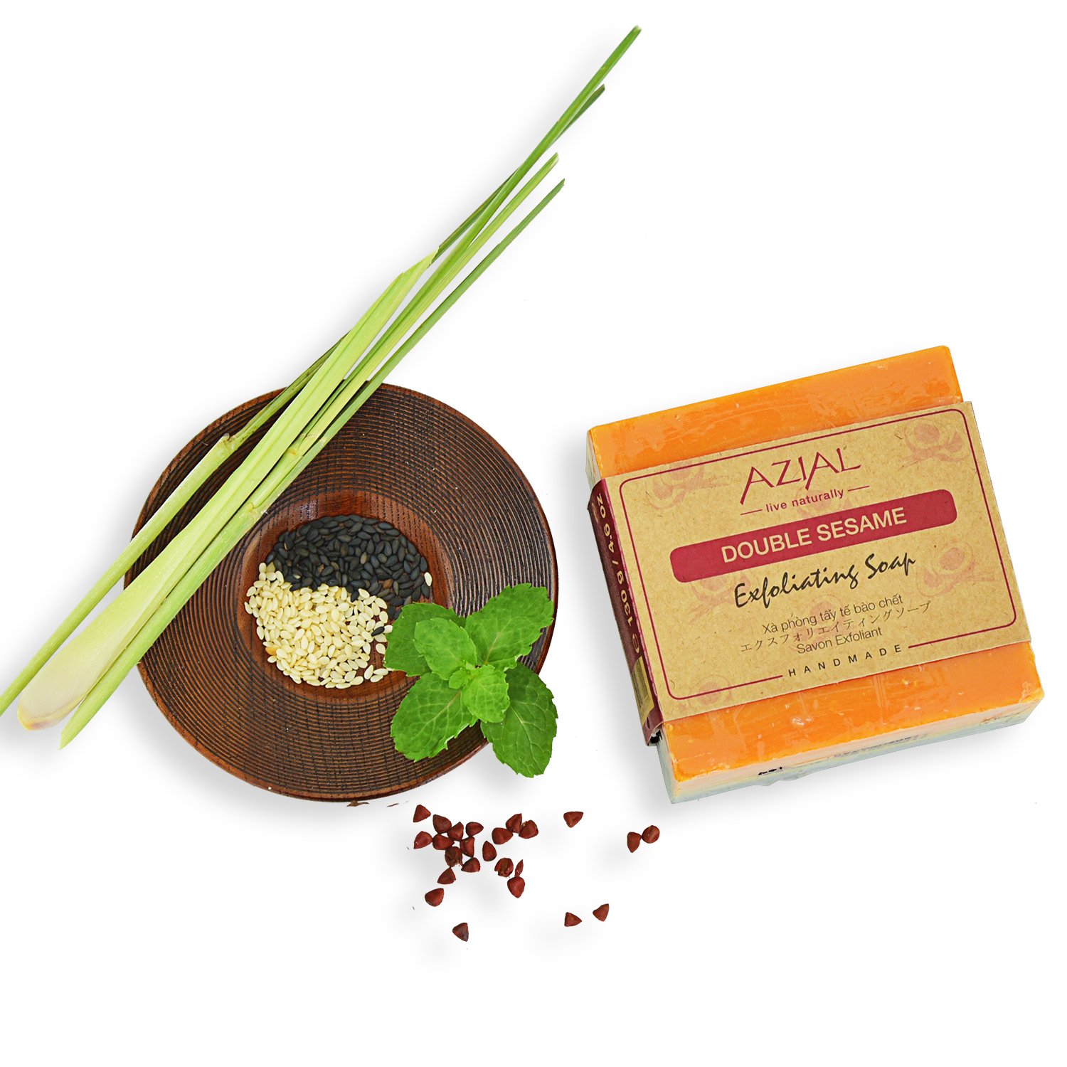 Xà phòng thiên nhiên Double Sesame thuộc dòng sản phẩm tẩy tế bào chết với thiết kế hai mặt độc đáo, một mặt chứa Hạt Mè Đen thô ráp và mặt còn lại chứa Hạt Mè Trắng mềm mịn. Với thành phần tinh dầu Bạc Hà, Sả Hồng & Thông, xà phòng giúp da sáng & khỏe mạnh, đồng thời mang lại cảm giác khỏe khoắn.
