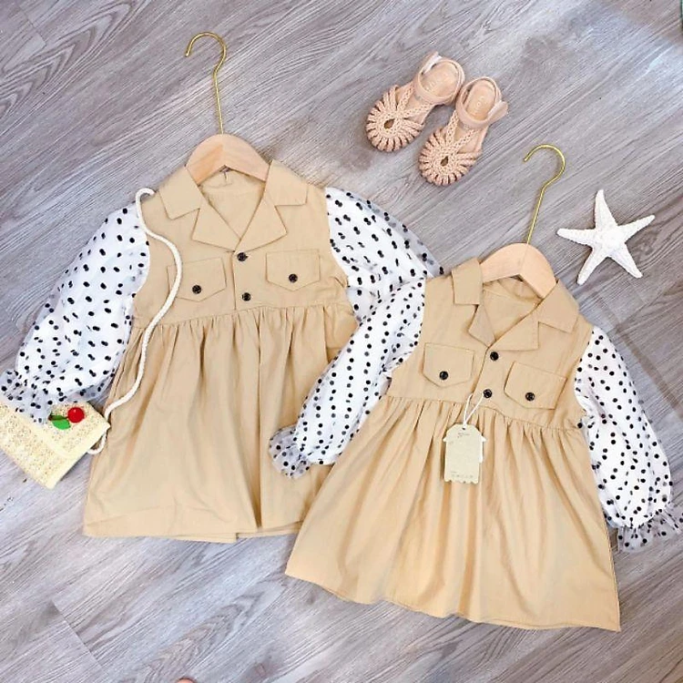 XẢ VÁY KAKI CỔ VEST TAY BI BÉ GÁI
