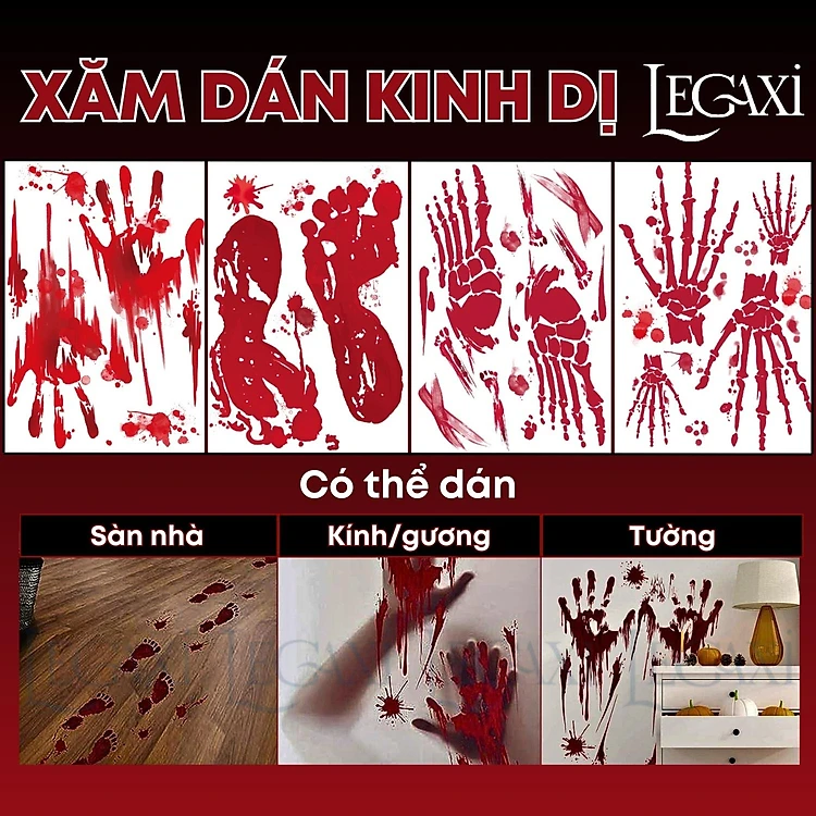 Xăm dán kinh dị trang trí nhà cửa Halloween bàn tay máu vệt máu dấu chân máu Legaxi