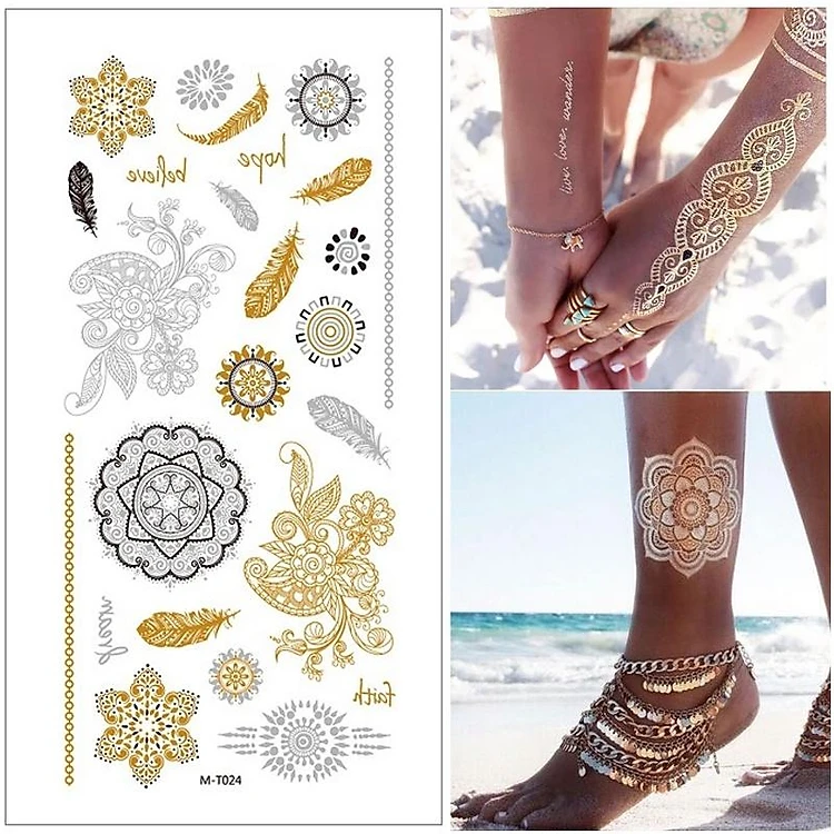 Xăm dán tạm thời họa tiết ánh kim, lông vũ, hoa lá, henna vintage thời trang nam nữ Legaxi
