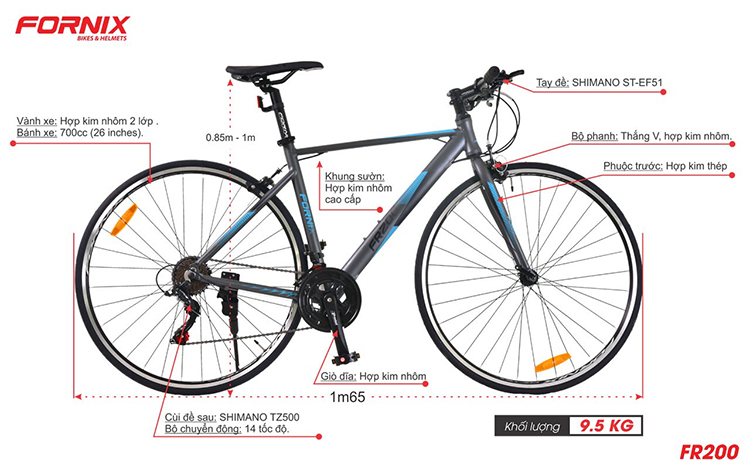 Xe Đạp Đua Fornix FR200 là dòng xe đạp đua nhưng được sản xuất riêng cho nhu cầu tập luyện thể thao của người dân sống trong khu đô thi, hoặc các bạn trẻ dùng để đi học, đi chơi dạo quanh ăn uống, xem phim cùng bạn bè. Với sườn xe được làm bằng nhôm và sự tối giản màu sắc trong thiết kế làm nổi bật kiểu dáng cứng cáp, vững chãi.