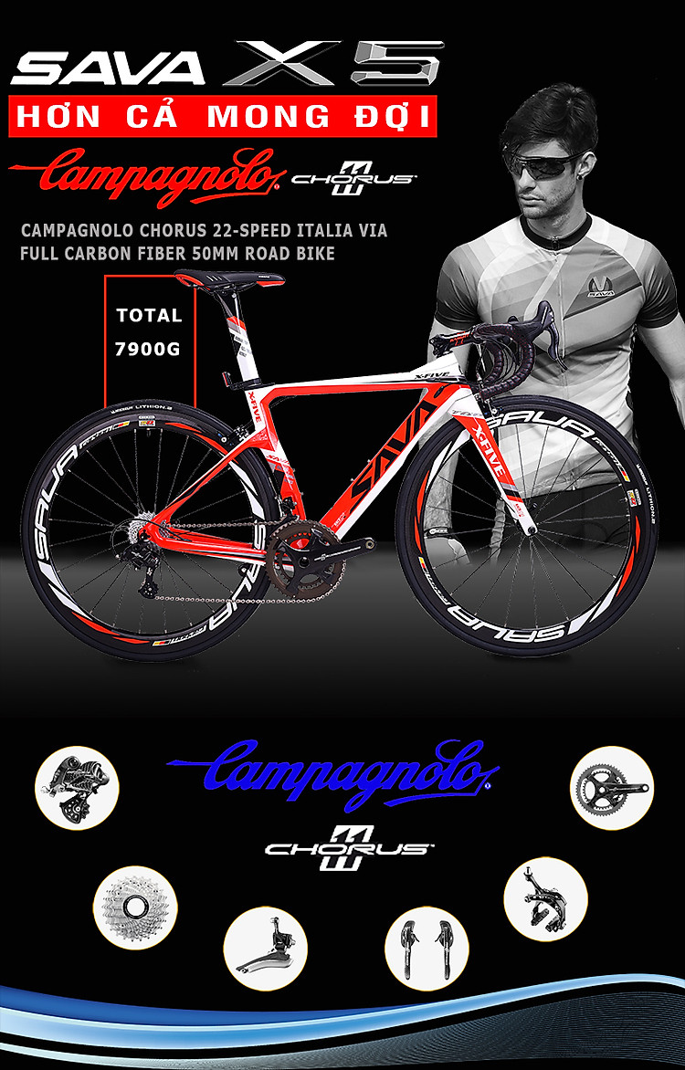 SAVA X5 được thiết kế từ cảm hứng mẫu xe hơi đình đám BMW X5 của Đức, Toàn bộ thiết kế toát lên sự mạnh mẽ nhưng cũng không kém phần lỳ lợm của một chiếc xe đua đường trường chuyên nghiệp. Hơn cả mong đợi, mẫu xe đua cao cấp này được chăm chút hơn với nhiều chi tiết nâng cấp hướng tới sự tiện dụng và vận hành hiệu quả. Điểm nhấn của xe chính là thiết kế khung toát lên sự mạnh mẽ, làm bật chất thể thao, khỏe khoắn với sự ghi điểm ở dóng đứng - có phần cong để bánh sau tiệm cận gần hơn với dóng đứng, tối ưu hóa khoảng cách, tạo lợi thế chuyển động tốt hơn cho người đạp. Xe trang bị Groupset CAMPAGNOLO CHORUS 11 – CARBON với cụm tay phanh, đùi đĩa và củ đề sau bằng sợi carbon giảm thiểu đáng kể trọng lượng, bộ đùm đề trước sử dụng vật liệu nhôm siêu nhẹ (các khớp nối vẫn dùng sợi carbon) là một trong những groupset cơ hiệu quả nhất của CAMPAGNOLO, cùng với thiết kế tương đồng với supper record danh tiếng, CHORUS 11 thực sự là groupset đáng đồng tiền bát gạo với thiết kế siêu đẹp và hiệu năng rất cao. Cũng như những người anh em đắt tiền của mình, CHORUS 11 sử dụng công nghệ Ultra - Shift có thể giúp người dùng giảm 3 số hoặc tăng 5 số trong 1 lần chuyển. |