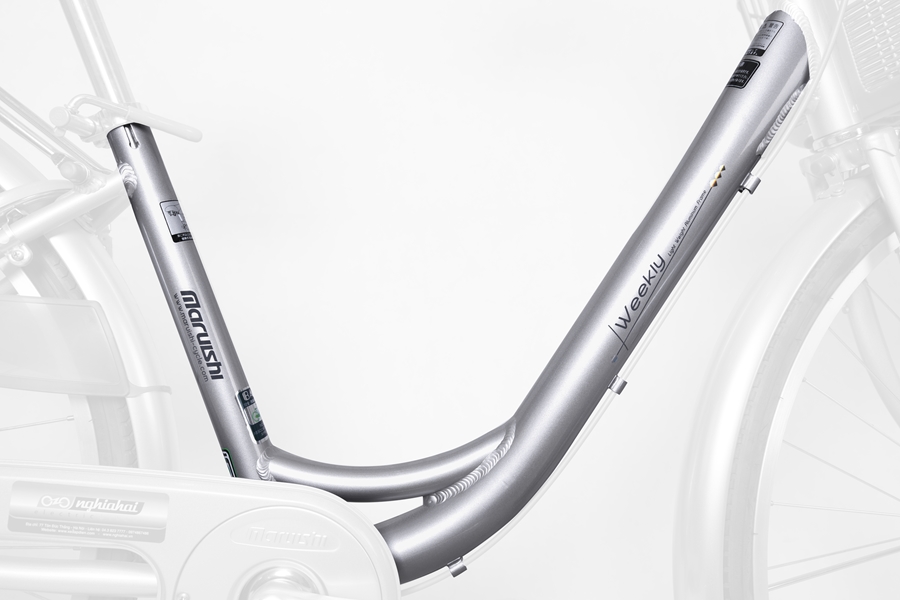Khung xe: là một bộ phận quan trọng cấu thành nên chiếc xe, nó quyết định đến độ chắc chắn của chiếc xe, tính thẩm mỹ, tư thế của người đạp xe. Với kiểu dáng thiết kế phù hợp sẽ tạo cho người đạp xe một tư thế thoải mái không bị gò bó, không gây cảm giác mệt mỏi, khung xe gồm 1 gióng to uốn cong thoải xuống nữ tính, được nối với trục dưới yên xe bằng mối hàn cao cấp. Hợp kim Nhôm được hãng Maruishi tin tưởng lựa chọn làm chất liệu cho khung xe nhờ vào đặc tính bền, chắc chắn, nhẹ, chống ăn mòn tốt, thậm chí cơ tính và tính đúc còn vượt trội hơn cả thép. Sau khi đã tạo ra một bộ khung cong mềm mại làm tôn dáng cho các chị, các mẹ, một lớp sơn tĩnh điện sáng bóng được bao phủ lên toàn bộ thân xe. Lớp sơn xe này được ví như mỹ phẩm của phái đẹp, luôn mang lại sự tự tin, xinh đẹp hơn. Chỉ khác một điều, một lớp mỹ phẩm cùng lắm giữ được 24 tiếng, còn lớp sơn này của hãng Maruishi thì bền chắc 5-7 năm.