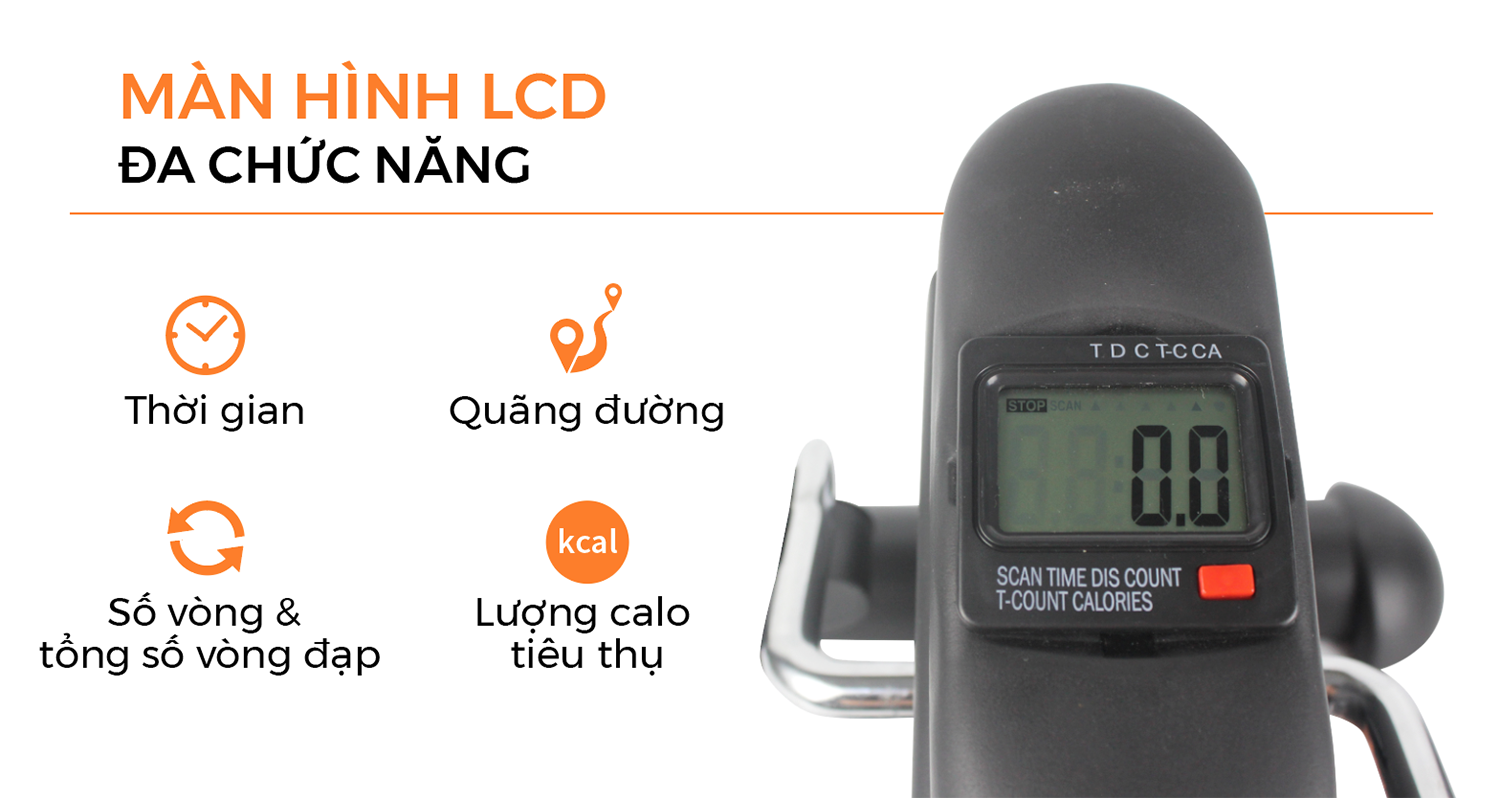 • Mặt chính giữa xe đạp có bảng điện tử theo dõi số vòng đạp của người tập. Đếm số calo tiêu thụ, quãng đường tập thông minh