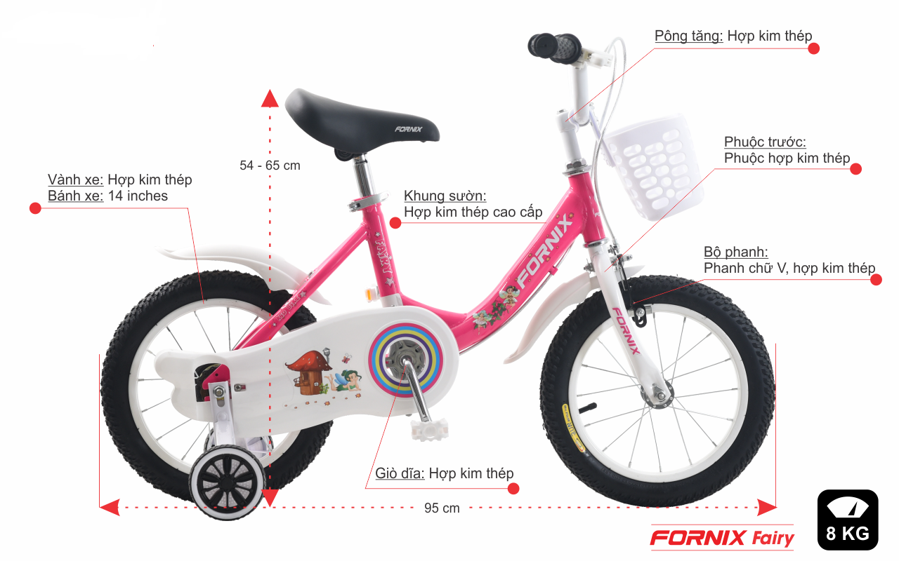 Với bánh xe 14 inches và được làm bằng hợp kim thép, FORNIX Fairy giúp bé có những trải nghiệm thú vị cùng chắc chắn, an toàn trên các loại địa hình khác nhau cũng như phần răng cưa tăng độ bám trên mặt đường giúp bé di chuyển an toàn ngay cả di chuyển trên các đoạn đường ẩm ướt.