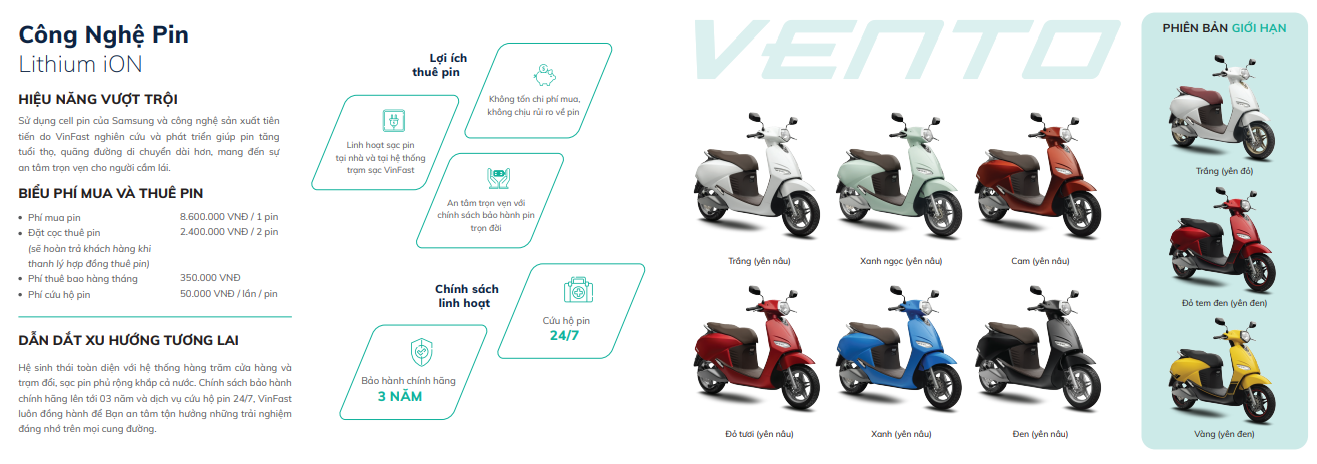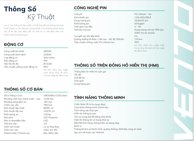 - Giá bán xe đã bao gồm VAT, 01 bộ sạc theo xe, chưa bao gồm lệ phí thuế trước bạ, làm giấy tờ, biển số. Xe sử dụng 02 pin Lithium.