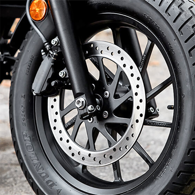 Bộ lốp to bản kích thước 130/90-16 (lốp trước) và 150/80-16 (lốp sau) cùng với khung nhôm đúc đen tuyền và hệ thống phanh đĩa cùng làm nên một Rebel hoàn hảo.