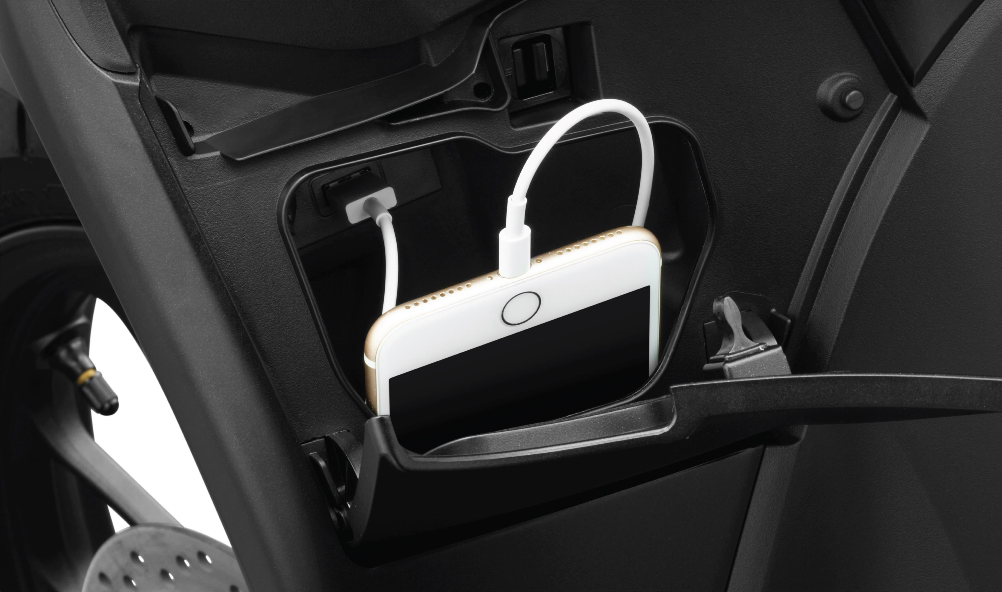 Hộc để đồ phía trước bên trái được trang bị trên dòng xe Sh mode với dạng nắp mở, tích hợp cổng sạc USB vô cùng tiện lợi.