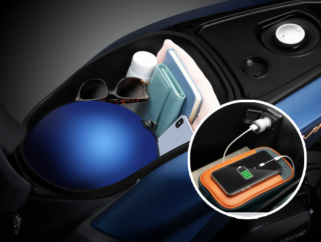 Hộc đựng đồ phía trước với kích thước rộng rãi, có khả năng chứa nhiều vật dụng cá nhân, nay được bổ sung thêm nắp đậy tiện lợi.