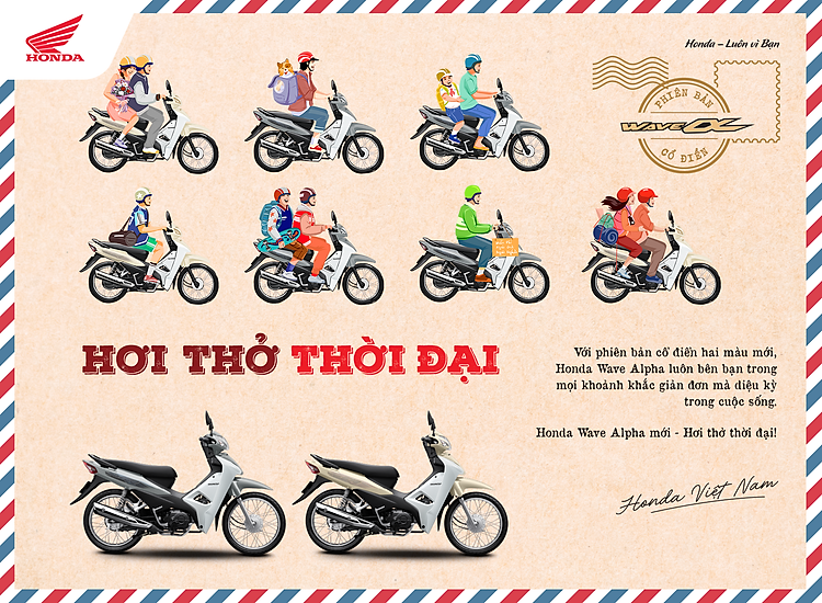 Ra mắt tháng 09 năm 2023, Wave Alpha phiên bản cổ điển với 2 màu hoàn toàn mới cùng bộ tem được phối màu đầy ấn tượng, thu hút ánh nhìn, giúp bạn thể hiện phong cách cổ điển trong thời đại mới.