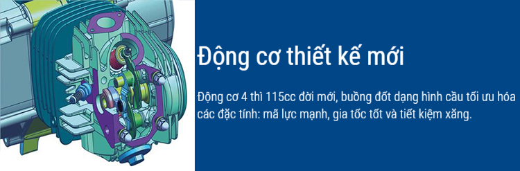 Động cơ 4 thì 115cc đời mới, buồng đốt dạng hình cầu tối ưu hóa các đặc tính: mã lực mạnh, gia tốc tốt và tiết kiệm xăng.