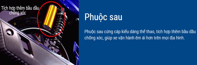 Phuộc sau cứng cáp kiểu dáng thể thao, tích hợp thêm bầu dầu chống xóc, giúp xe vận hành êm ái hơn trên mọi địa hình.