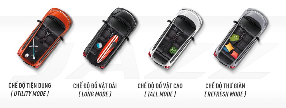 Chế độ tiện dụng (Utility Mode): Ở chế độ này, hàng ghế thứ 2 của Jazz có thể gập phẳng hoàn toàn, thông hẳn với khoang chứa đồ, đem đến một sàn phẳng với diện tích lớn, người dùng có thể đặt nhiều đồ vật cồng kềnh có kích thước lớn như một chiếc xe đạp, bộ bàn ghế hay cả một dàn loa.