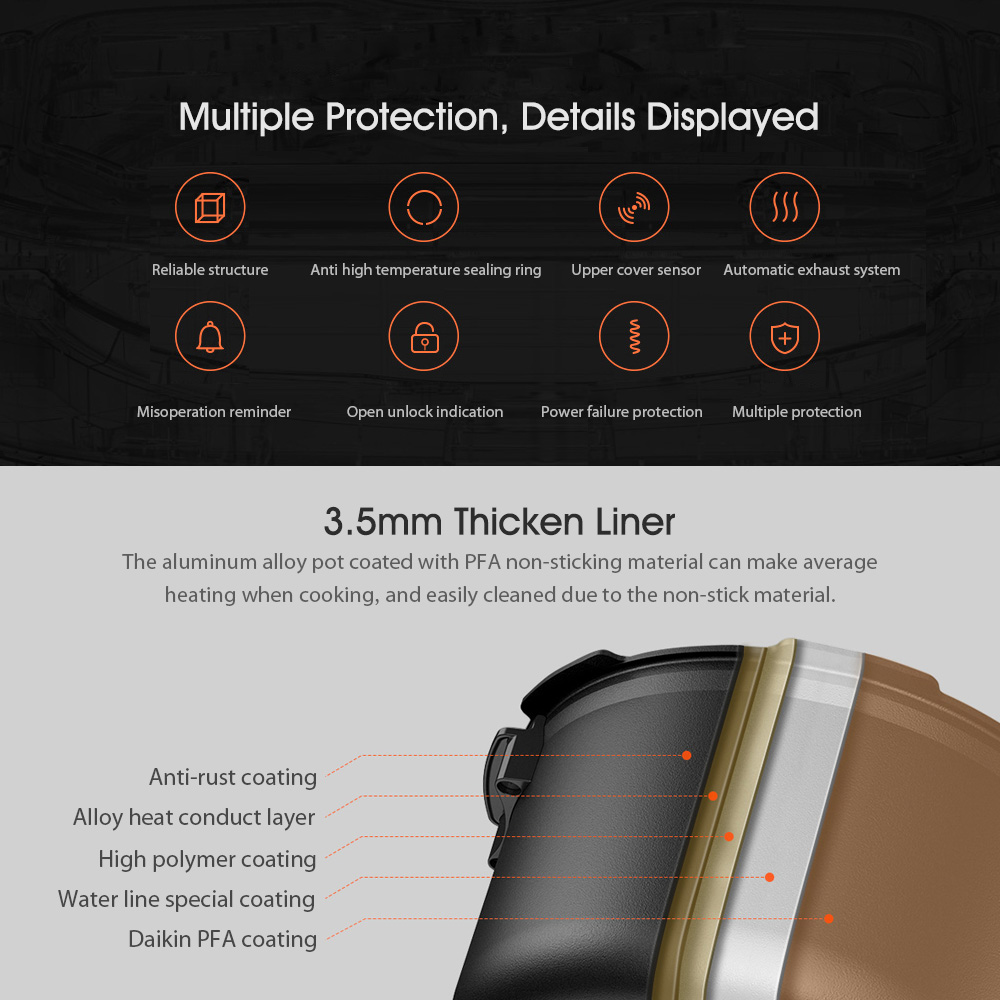 * Multiple protection including Anti high temperature sealing ring/Upper cover sensor/Automatic exhaust system and more.