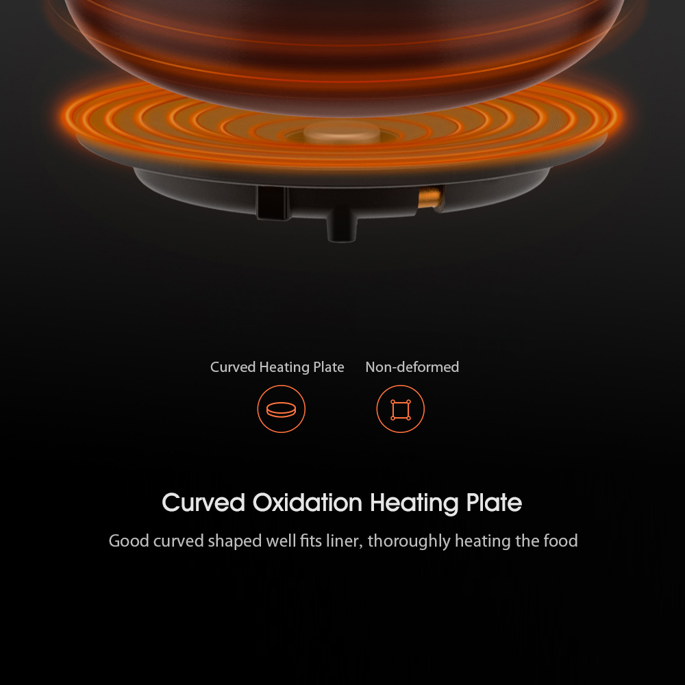 * Curved oxidation non-deformed heating plate well fits liner, thoroughly heating the food.