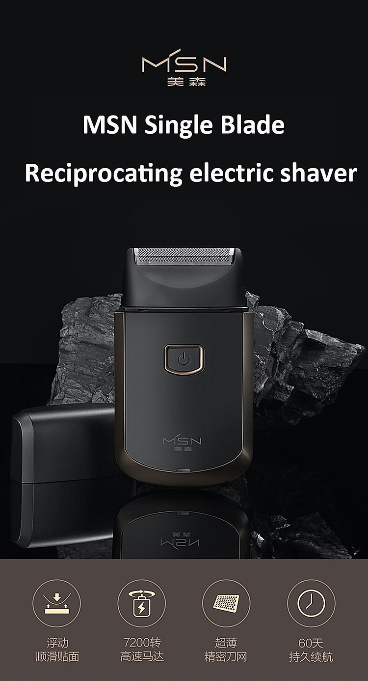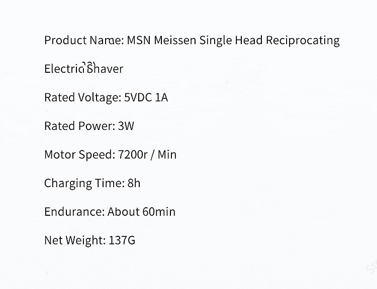 Product Name: MSN Electric Shaver Rated Voltage: 5VDC 1A Rated Power: 3W Motor Speed: 7200r / Min Charging Time: 8h Work Time: About 60min Net Weight: 137g