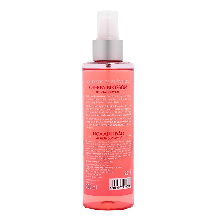 • Xịt Thơm Dưỡng Thể Hoa Anh Đào Purité De Prôvence (200ml) được chọn lọc những nguyên liệu tự nhiên tinh khiết và giàu dưỡng chất làm đẹp, đem đến cho phái đẹp trải nghiệm như đang hòa mình vào thiên nhiên thuần khiết.