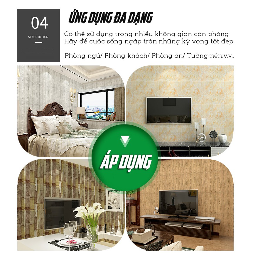 Kích thước xốp dán tường 3d giả gạch, vân đá, vân gỗ thông thường là 70cm x 77cm, diện tích 1 tấm sẽ là 0,54m2.