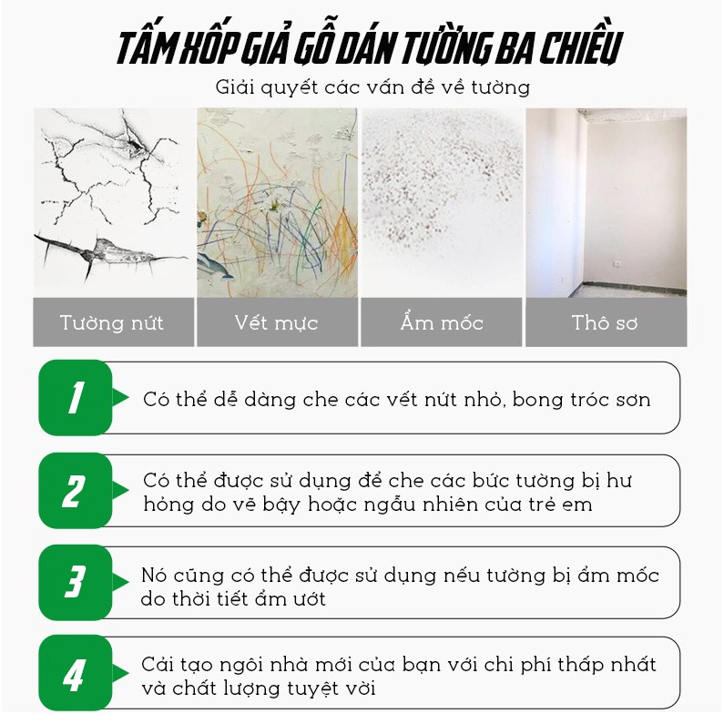 Chịu lực mạnh, khả năng cách âm, cách nhiệt tốt Chống thấm nước, ẩm mốc,mang lại cho bạn không gian sạch sẽ và trong lành Sản phẩm có thể dán, ốp được trên bề mặt tường, gỗ, kính, kim loại, inox, tường vôi, tường móc bẩn,…