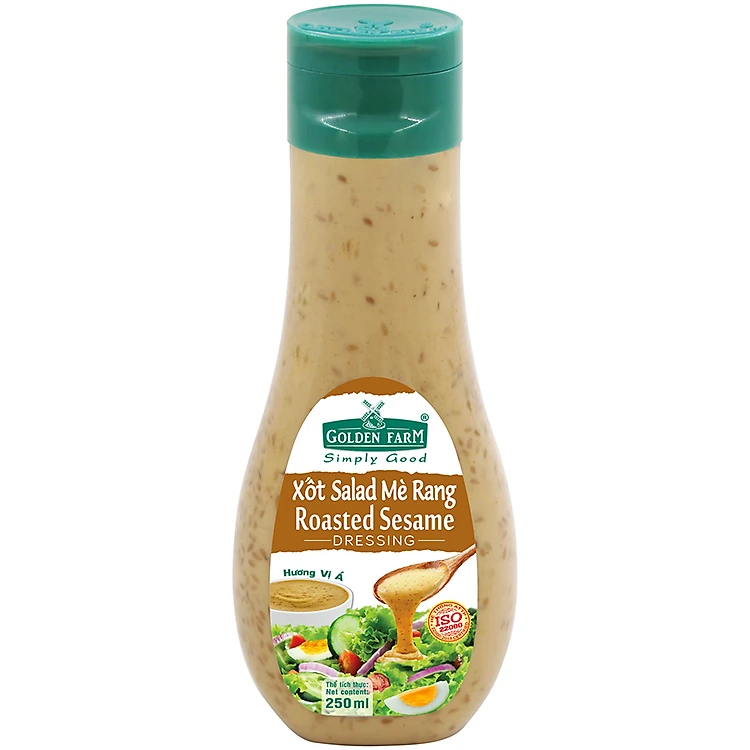 Xốt Salad Mè Rang Golden Farm (250ml) Với những thành phần bổ dưỡng và hương vị mè rang thơm ngon, sốt sald mè rang sẽ giúp cho bữa ăn của bạn thêm hương vị thiên nhiên và tốt cho đường tiêu hóa. Sản phẩm phù hợp với các món ăn salad theo chế độ ăn kiêng.