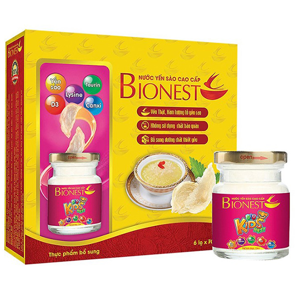 Yến sào cho bé biếng ăn Bionest Kids với thành phần từ yến sào thiên nhiên kết hợp với hồng sâm Hàn Quốc, giúp tăng cường sức khỏe một cách tự nhiên và an toàn. Lysin hỗ trợ trẻ biếng ăn, giúp ăn ngon... Taurine có tác dụng tham gia các quá trình chuyển hoá quan trọng trong cơ thể bé. Đặc biệt, Taurine có nhiều trong các mô cơ thể, trên võng mạc, bạch cầu, giúp cơ thể của chống ôxy hoá. Ngoài ra, Taurine còn hỗ trợ cho sự phát triển của hệ thần kinh trung ương và thị giác của bé. Bên cạnh đó, sản phẩm còn giúp bổ sung canxi giảm nguy cơ loãng xương. Vitamin D3 giúp cơ thể hấp thụ canxi, Vitamin D và canxi được sử dụng để điều trị hoặc ngăn ngừa chứng loãng xương, cải thiện sức khỏe răng miệng. Chất xơ hỗ trợ tiên hóa tốt cho bé. Sợi tảo biển giúp cung cấp một dưỡng chất cần thiết cho cơ thể phù hợp với hoạt động của cơ thể.