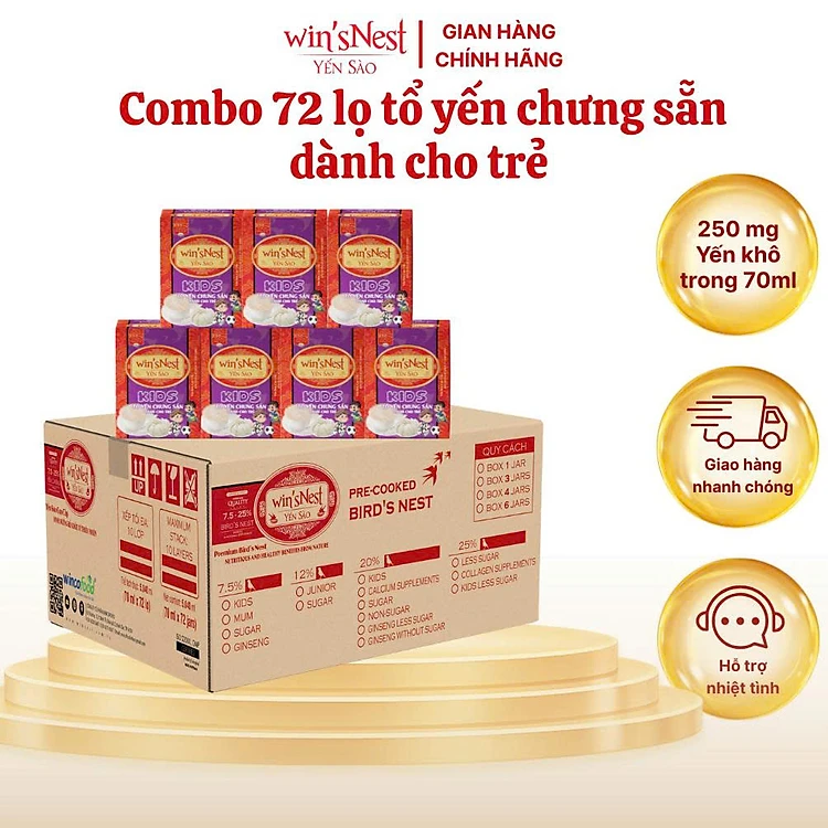 Thùng 72 lọ Yến Sào Win'snest Kids Tổ Yến Chưng Sẵn Dành Cho Trẻ 20% (70 Ml/ Lọ)