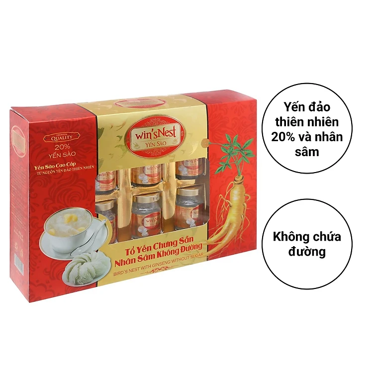 Yến Sào Win'snest Tổ Yến Chưng Sẵn Nhân Sâm Không Đường 20% (6 Lọ/Hộp) thích hợp cho người lớn, người bệnh đang trong quá trình phục hồi sức khỏe, người ăn kiêng và tiểu đường.