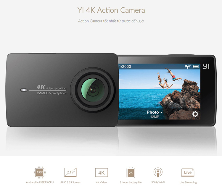 Camera hành động Yi 4K sử dụng cảm biến IMX377, 12MP đến từ Sony. Đi cùng với việc nâng cấp bộ xử lý hình ảnh lên con chip Ambarella A9 mới, mang đến cho chiếc camera khả năng quay phim 4K chất lượng, cùng khả năng chụp ảnh tĩnh độ nét cao.